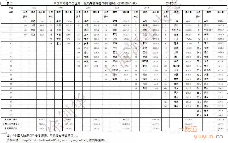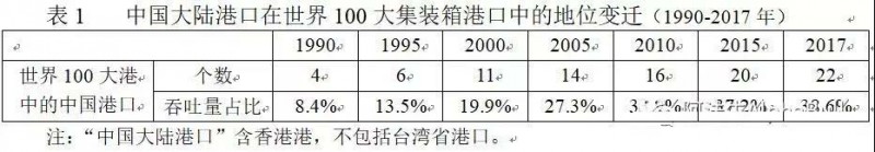 从2000年至2017年,在世界100大港中,中国大陆港口的数目从11个增加一倍,至22个;吞吐量比重增加近一倍,从19.9%增加到38.6%。