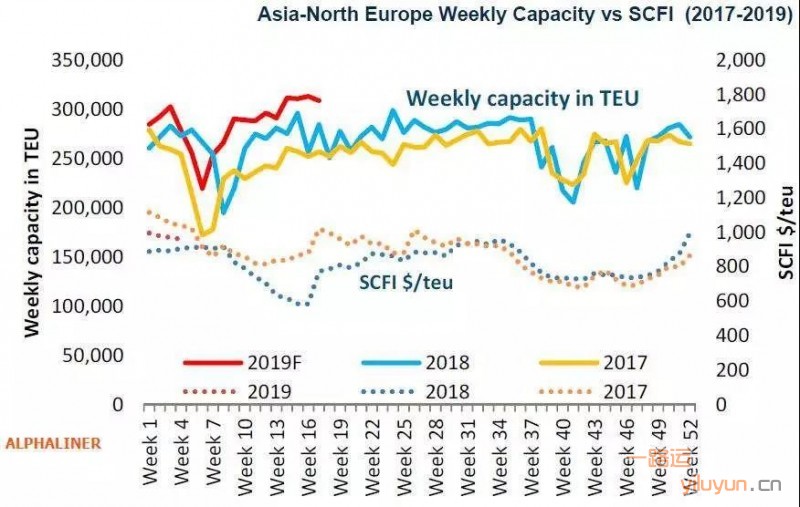 迄今为止,世界上所有18,000 TEU以上船几乎全部投放在亚欧贸易通道上。按照经济学原理,最大的船应该配置在运量最大的航线上,以Alphliner第一季度的数据为例,亚洲-北欧航线上的每周平均运力配置约为32万TEU;而亚洲-北美航线上的每周平均运力配置约为47万TEU,比亚欧航线高出30%。也就是说,最大的船本该配置在亚洲-北美航线,但是现在它们只是被配置在航程最长的航线上。