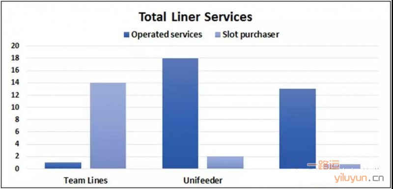Carrier Dashboard工具还显示Team Lines在14条服务航线购买了舱位,所有这些服务航线都只挂靠北欧港口。其中13条服务航线由Unifeeder运营,东方海外是其中两条服务航线的次要运营商。另外113条服务航线由MacAndrews运营。