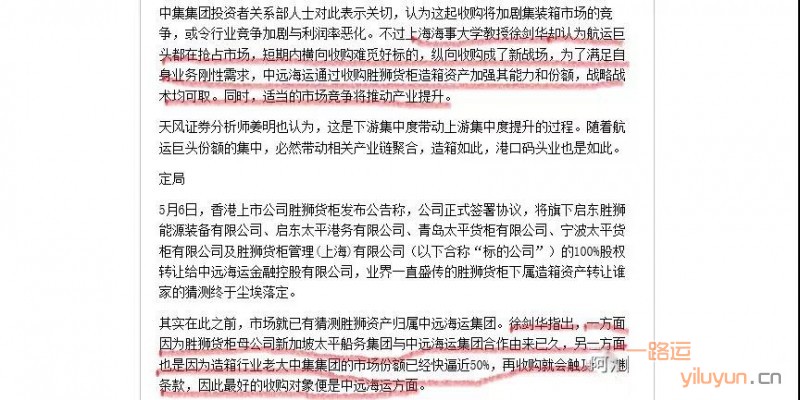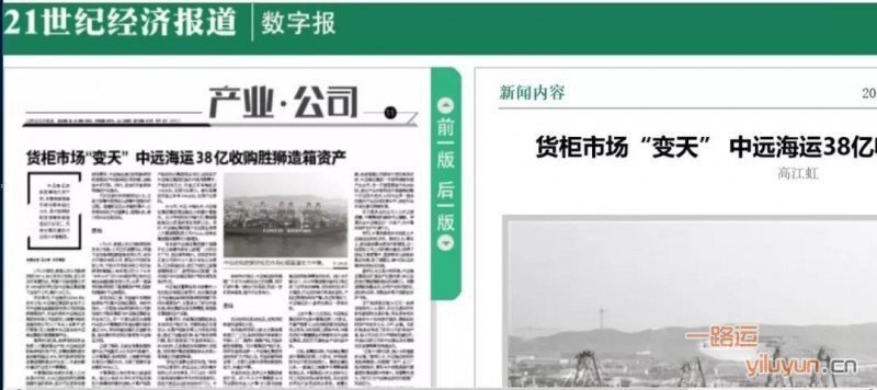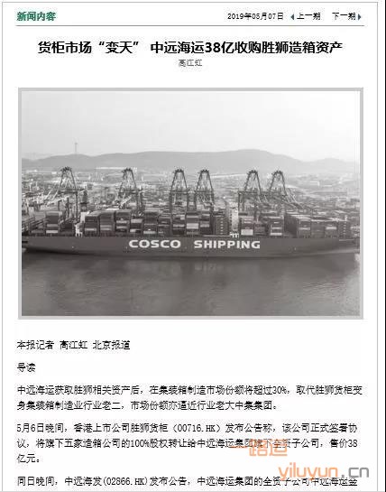 今天(5月7日),据“21世纪经济报道”,中远海运38亿收购胜狮造箱资产。胜狮是新加坡太平船务旗下资产,世界第二大集装箱制造商。